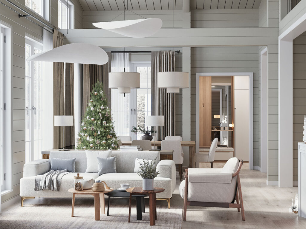 Интересный проект загородного дома с расчетом на проживание двух-трех семей, в сканди стилистике с использованием минималистичных приемов декорирования. В интерьерах комнат используются преимущественно светлые материалы с акцентом на естественную модель освещения — классические окна, которые есть даже в сауне и душевой.