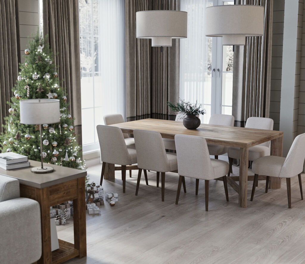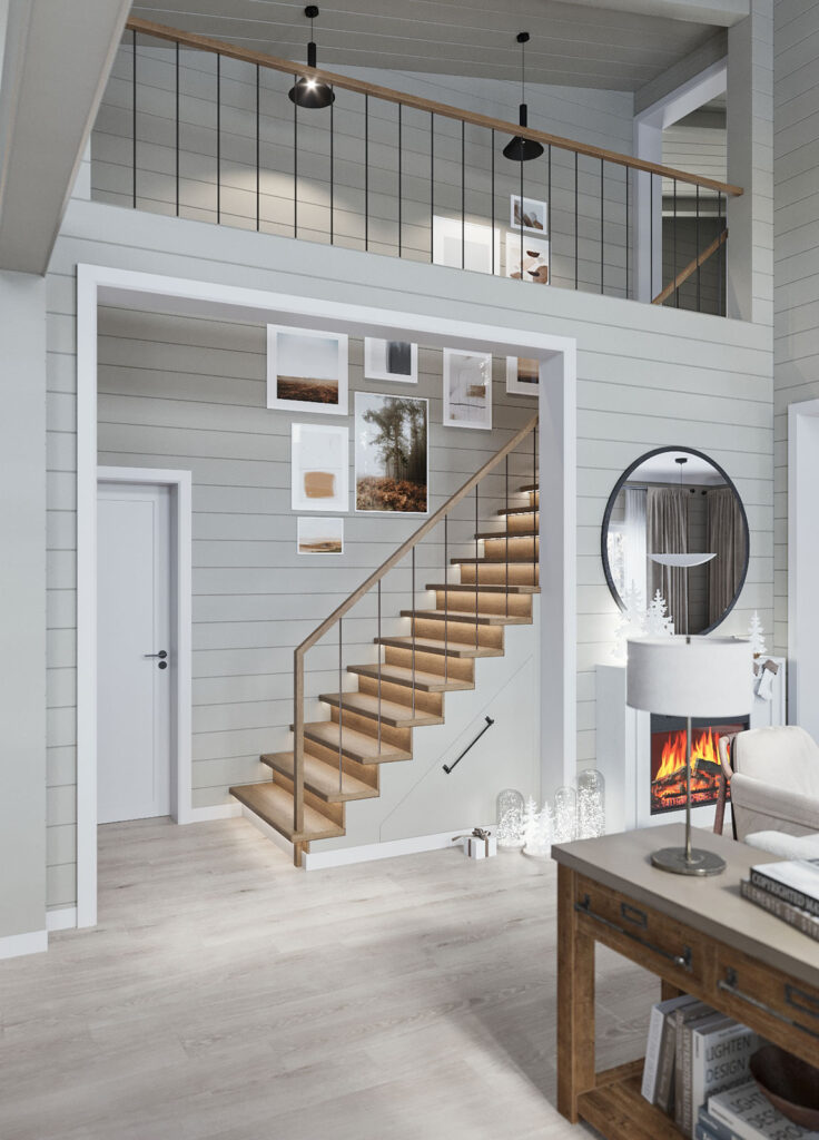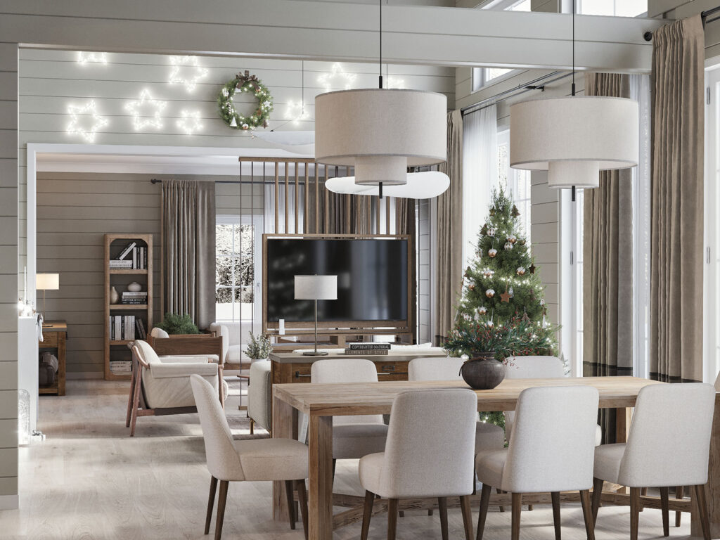 Простая и функциональная прихожая, вид на гостевую и обеденную зоны. В смешанной стилистике используются светлые материалы в сочетании под дерево. Подвесные светильники должны создавать мягкое, теплое освещение зон.
