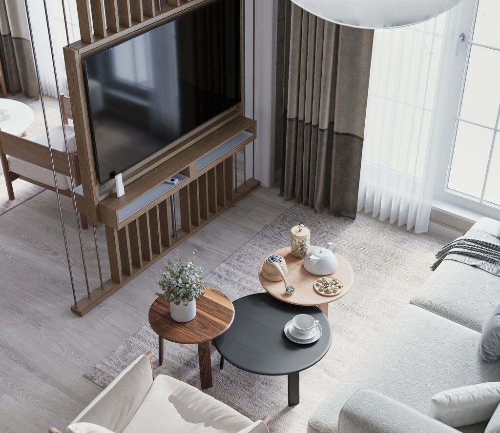 На большой, открытой площади первого этажа были распределены основные зоны. Акцентом является сквозная перегородка с вращающейся тв-панелью между двумя зонами с группами мебели.