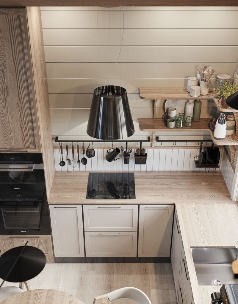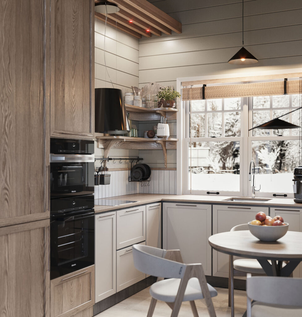 Особенностью в решении кухни является использование подвесной вытяжки. Изначально это пожелание заказчика. Маленький круглый столик — в удобном месте для того, чтобы попить чай, пообщаться с гостем.
