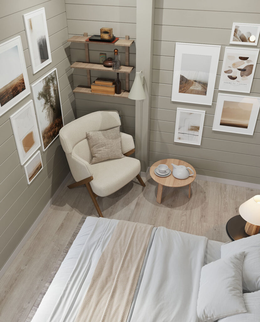 Спальня на первом этаже для пожилой женщины. Мягкие теплые тона и все под рукой.